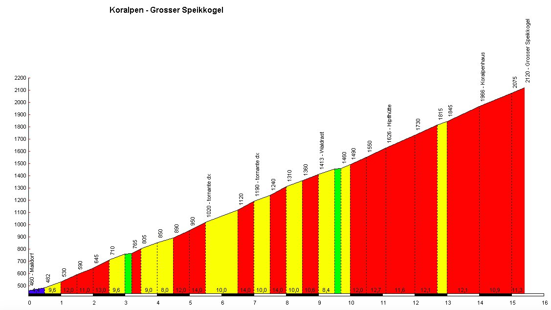 Subida situada en Carintia, en el sur de Austria, forma parte de los Alpes. Su inicio reside en Maildorf y tiene una longitud de 15,4 km. El porcentaje medio de las rampas que te encontrarás en esta subida es del 10,8%. Probablemente, la principal dificultad de esta subida Koralpen – Grosser Speikkogel reside en la irregularidad del terreno y en los últimos kilómetros, especialmente duros.