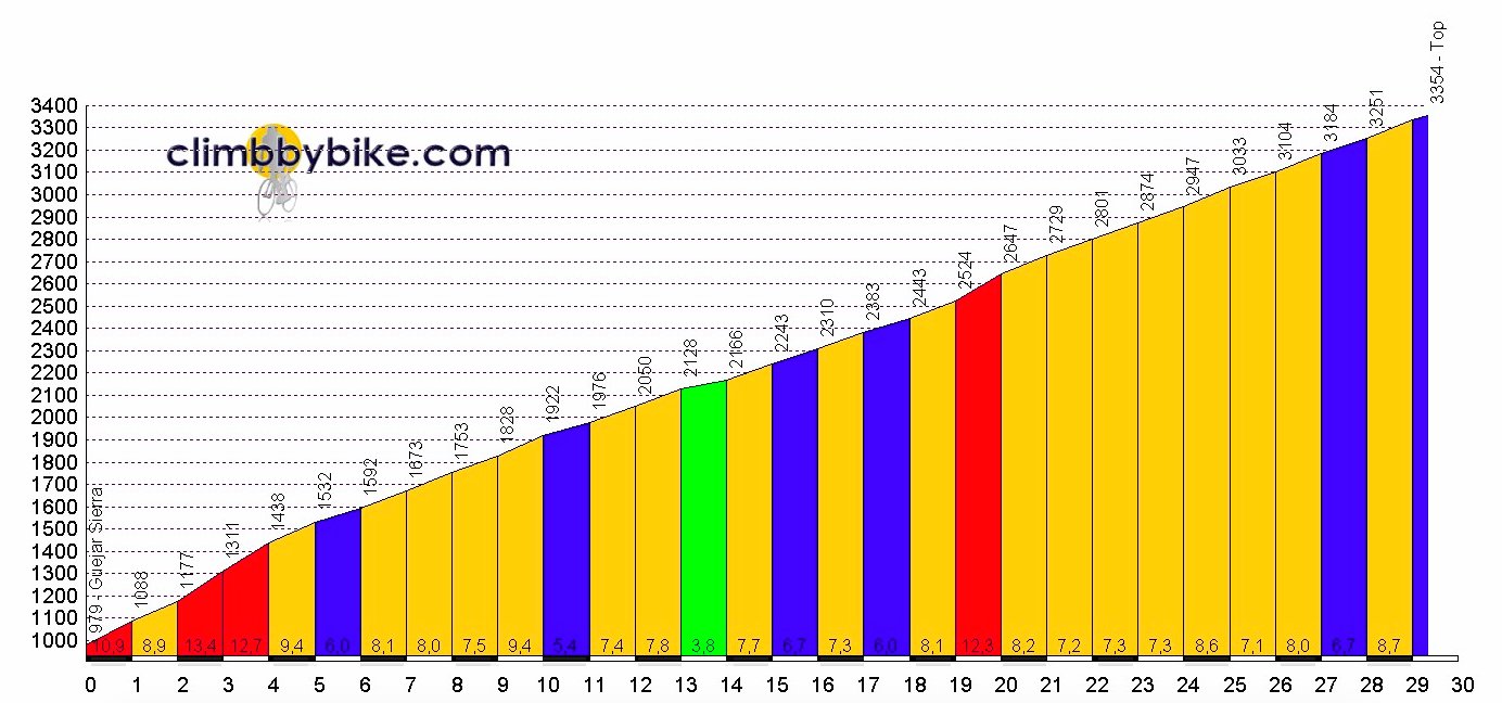 Y no podía faltar alguna subida en territorio español. En este caso es el Pico Veleta, que con una altitud de 3.395 metros se convierte en la cuarta cumbre más alta de España (le superan Teide, Mulhacén y Aneto). Situado en la cordillera de Sierra Nevada, es un pico de gran belleza pero especialmente duro, por diversos factores. Uno de ellos, su longitud, en total 30 km de ascensión si se empieza en el municipio de Güéjar Sierra (Granada).