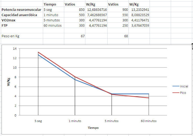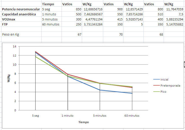 Una de las principales ventajas de tener un perfil de potencia es poder ver la evolución durante la temporada. Ésto nos permitirá saber si vamos por buen camino o tenemos que replantear entrenamientos. Por ejemplo, si lo que vamos a plantear como objetivo del año es un Ironman, o un MD, lo que interesa es subir el FTP en detrimento de capacidades más anaeróbicas (que habrá que seguir trabajando).