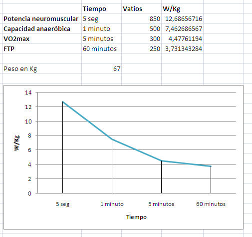 Una vez aislados los datos, hay que pasarlos a un valor relativo. Es decir, pasarlo a W/Kg, ya que como veremos más adelante trabajar con vatios absolutos no tiene mucho sentido. Para ello simplemente basta con dividir la potencia obtenida entre el peso del momento del test/entreno/competición. Hay que tener esto en cuenta. Si no sabemos el peso que teníamos en ese momento el resultado no será fiable.