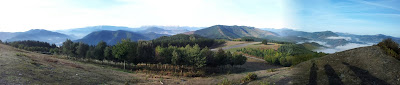 Por tramos vislumbramos zonas del descenso de monte BTT, Campeonato de Euskadi, que se celebra en esa ladera. Hay que estar loco, la verdad. Vaya descenso, jalonado de raices, ramas sueltas, tubos…nosotros a lo nuestro. El monte empieza a ser menos denso, los pinos van dejando paso a los claros y ya vislumbramos las primeras campas.Varios caballos pacen a gusto, sin nada ni nadie que les moleste. ¡Naturaleza en estado puro! Seguimos ascendiendo, y ya divisamos enfrente nuestro destino. Vamos que solo queda una pequeña subidita sobre hierba y ya está. Las vistas ES-PEC-TA-CU-LA-RES. Divisamos las cadenas montañosas que rodean el valle encartado.Como ejemplo, sirva la foto:
