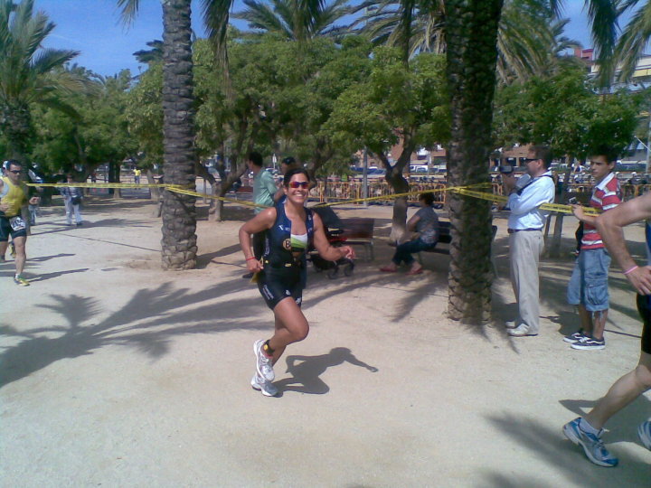 La salida, aunque somos más chicas de lo que suele ser habitual, se hace de maravilla sin golpes ni codos ni nada, nadando perfectamente. Salgo más o menos en la posición 22 ( de chicas), muy satisfecha, aunque se que es un tiempo mejorable. Otra vez tengo problemas con desengancharme el belcro del neopreno, pero bueno..al final todo se consigue. La bici, que deciros, la primera vuelta las piernas las tengo algo pesadas y no consigo engancharme a un grupo que tengo delante, me pasan dos chicas pero tampoco consigo quedarme con ellas. Al final una chica se descuelga, le propongo hacer relevos las dos, pero ella ya tiene bastante con mantenerse enganchada a mi, así que me quedo sin ni siquiera un relevo, cosa que me ha servido para darme cuenta que me falta un poco de chispa en la bici, mantengo bien la velocidad, pero en las salidas de rotondas y similares me cuesta arrancar. Aún y así he disfrutado de la bici y como siempre se me ha hecho cortísima. La T2 rápida me pongo a correr, pero buffffffffff…mis pies pesan muuuucho, la primera vuelta más lenta que una tortuga y con malas sensaciones, la segunda algo mejor, pero quería recuperar algo del tiempo perdido en la primera vuelta, asi que tocó apretarl os dientes hasta llegar a meta para finalmente conseguir un tiempo de 1h 16. y la 31ª posición.Que no esta nada pero que nada mal (al menos para mi :p )