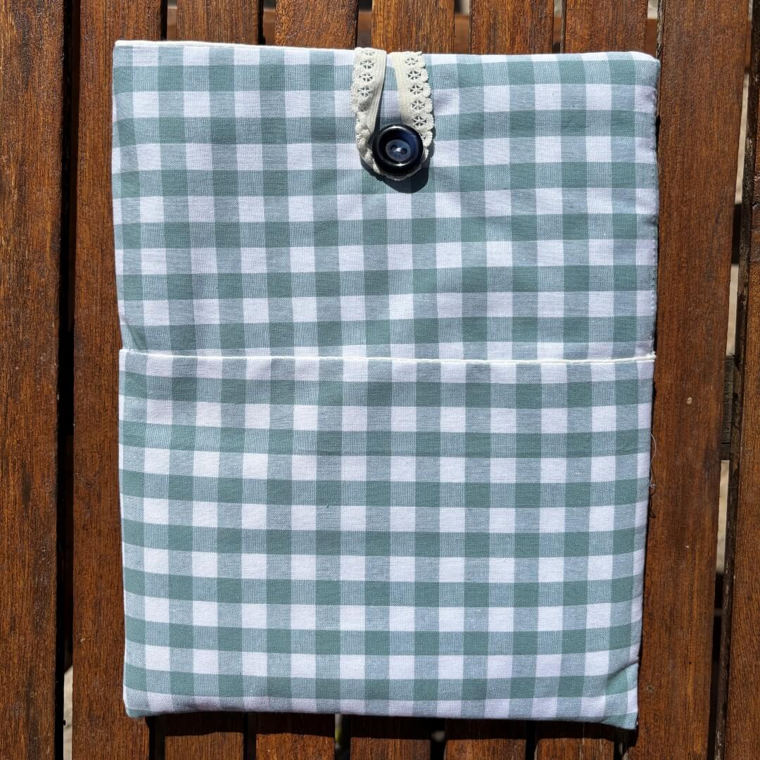 Funda acolchada con bolsillo exterior. Confeccionada a mano con un alegre tejido de loneta de algodón estampado vichy azul. Cierre con botón y elástico de encaje en color crema Interior de la funda y del bolsillo con forro. Cabe una tablet de 9.7”. Medida exterior 20×24 cm.