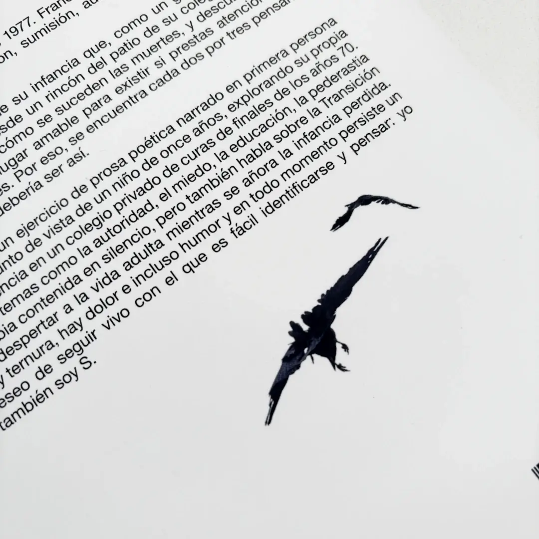 S es un niño al final de su infancia que, como un guardián entre el centeno, observa, desde un rincón del patio de su colegio, cómo se desarrolla la vida y cómo se suceden las muertes, y descubre que el mundo no es un lugar amable para existir si prestas atención a los pequeños detalles. Por eso, se encuentra cada dos por tres pensando que la vida no debería ser así.