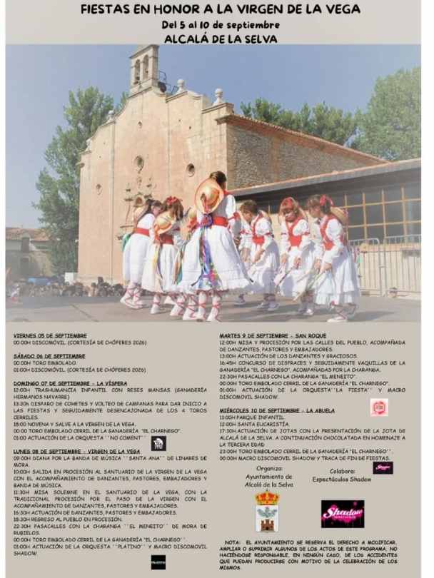 Aquí vas a conocer el programa completo de las fiestas en honor a la Virgen de la Vega en Alcalá de la Selva, que tendrán lugar entre los días 5 y 10 de Septiembre.