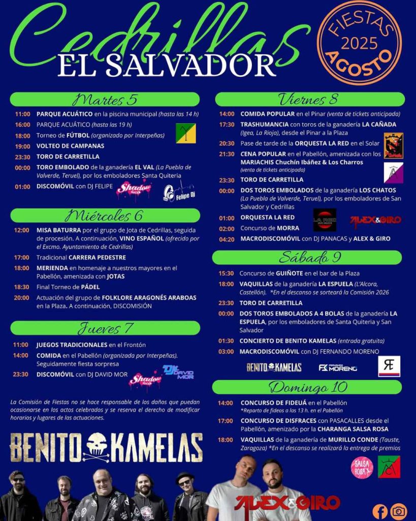 Aquí vas a conocer el programa completo de las Fiestas de Cedrillas 2025 de Agosto, las Fiestas del Salvador, que tendrán lugar entre los días 5 y 10 de Agosto.